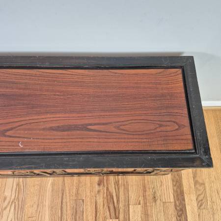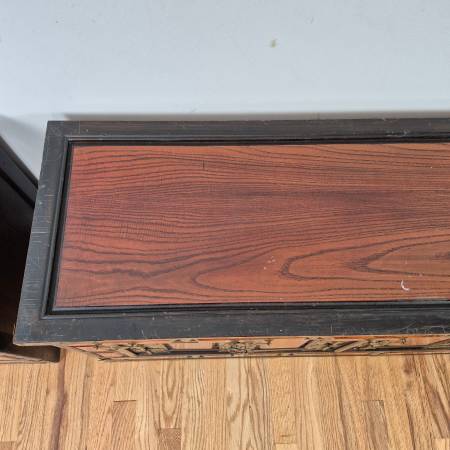 The 20th century cabinets are both sturdy and beautiful. One cabinet has fully functioning drawers and doors. The other has one broken door hinge and one drawer missing the side and back panels. There are scratches on the tops and bases from normal wear. Please see photos for more details about condition.