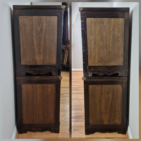 This is a handsome pair of vintage Korean storage cabinets that can stack to form a dresser or separated into two pieces that can serve as nightstands, end tables, or even benches. The cabinets are sturdy enough to sit on and are an appropriate height for a bench. These would be stunning benches lining a long entry way to hold shoes, gloves, keys, etc.