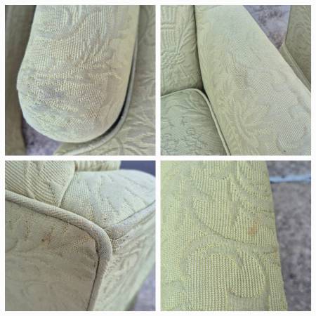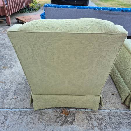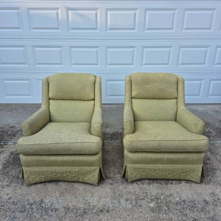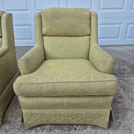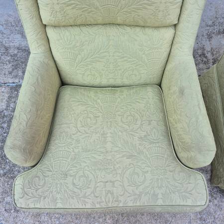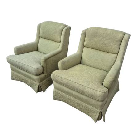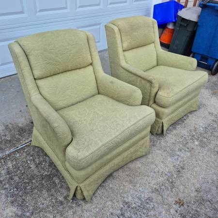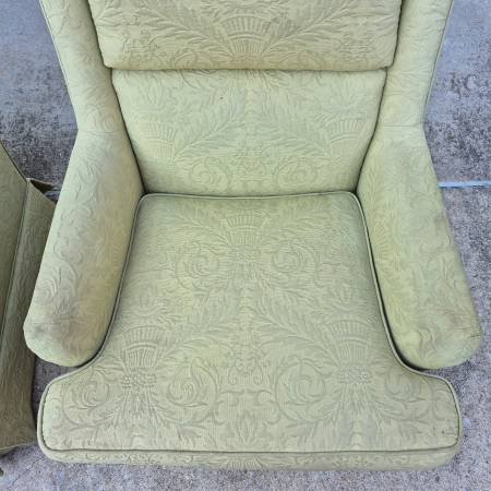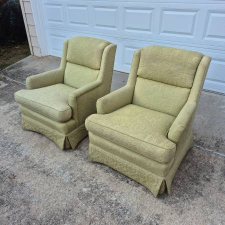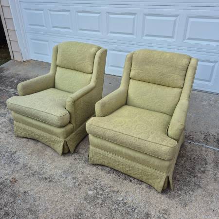 The chairs have discoloration on the fabric and should be cleaned or reupholstered, but they have a cool midcentury wingback profile and would look great in the right space. For color reference, the fabric is similar to Benjamin Moore 503 Fraser Fir.