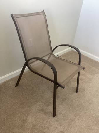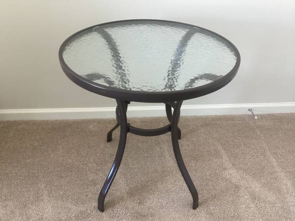Sturdy metal frame with a clear top and 2 chairs. Perfect for a balcony or patio. Both table and chairs are very clean and sturdy.