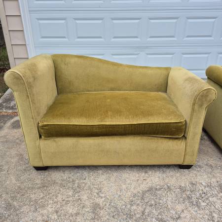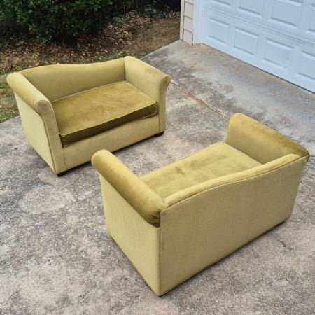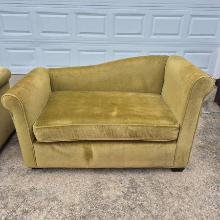 The late 20th century chaises are in fair used condition. The high-quality American made sofas are heavy, solid, and sturdy, with firm and supportive cushions. The upholstery is definitely worn and will likely need to be replaced. There are numerous stains as well as worn velvet nap on the arms. Please zoom in on the photos for more details about condition.