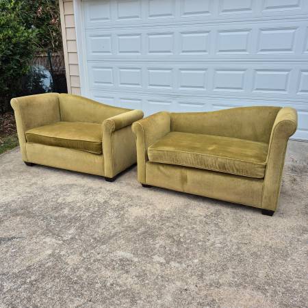 This is an unusual pair of American made Flexsteel left and right chaises currently upholstered in olive green velvet with solid wood feet.
