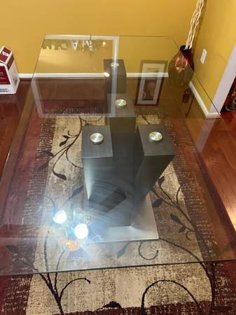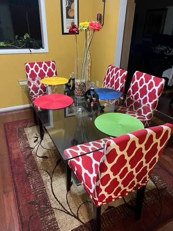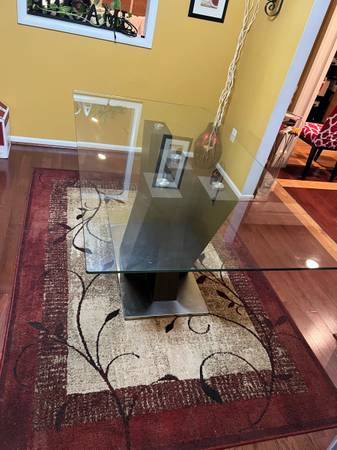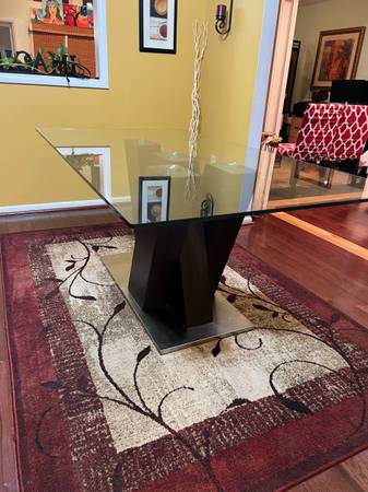 Beautiful rectangular modern glass dining table with decorative wood and metal base. Seats up to 6 chairs. Four chairs are free if you like them. L-71”, W-40”H-30”. Base: L-39 1/2” and W-19”. Available for immediate pickup and reasonable offers only.