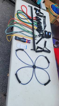 Clearing out a complete at-home workout kit — resistance bands, exercise bar, Pilates ring, yoga mat, ankle straps, and loop bands. Everything is in good working condition, lightly used, and priced to move. Prices listed or OBO.