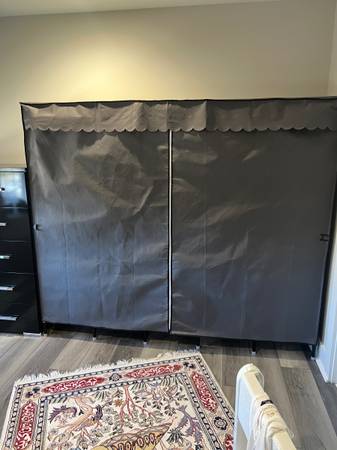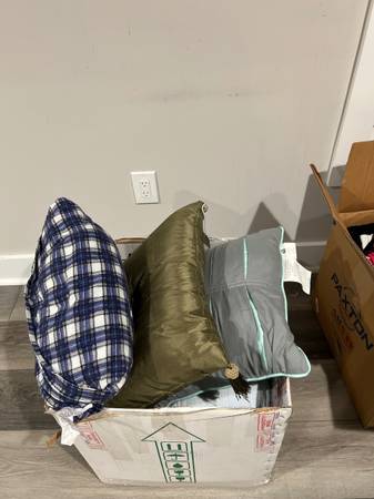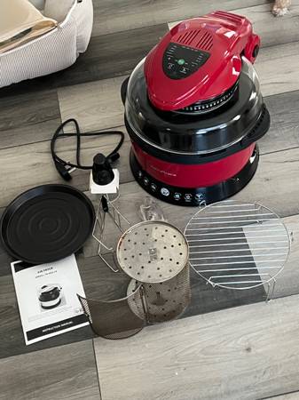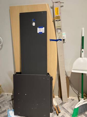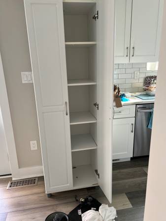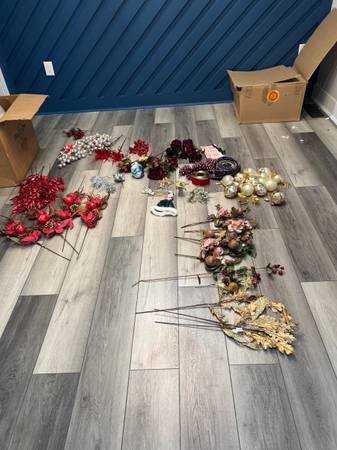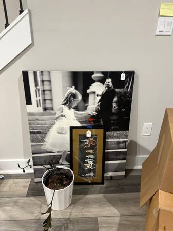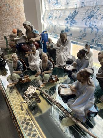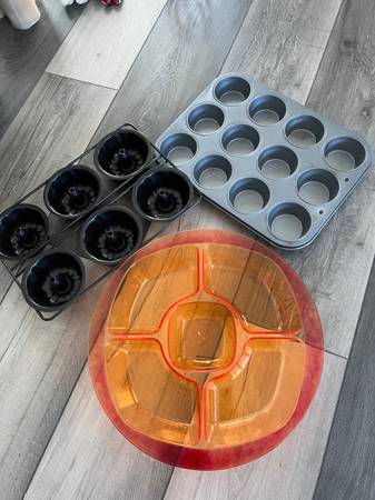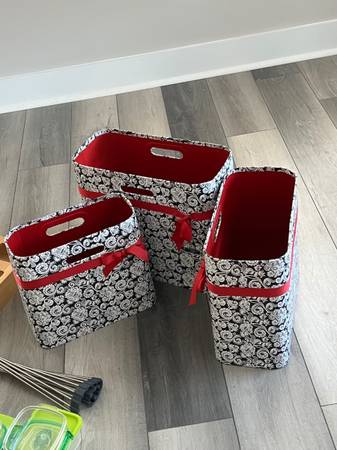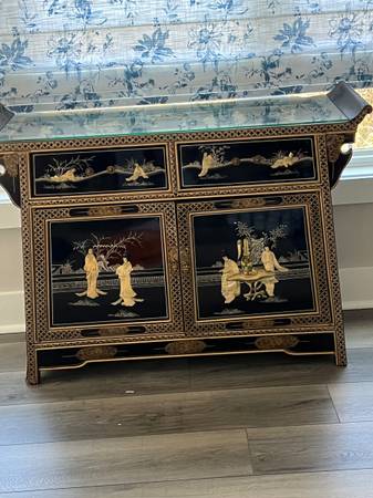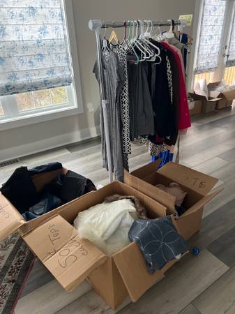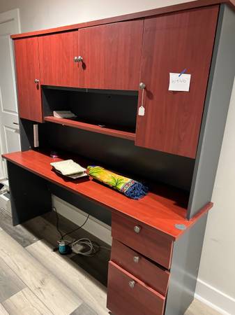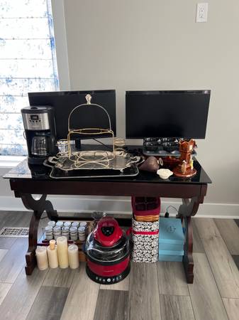Glass top desk with drawer, all wood desk, kitchen stuff, kitchen tall cabinet, antique pieces, Chinese figurines, China cabinet for dining room, cloths, bedding, Prada slippers, x-mass decoration, large air fryer, drawer organizer, baskets, thick kitchen mats, and more