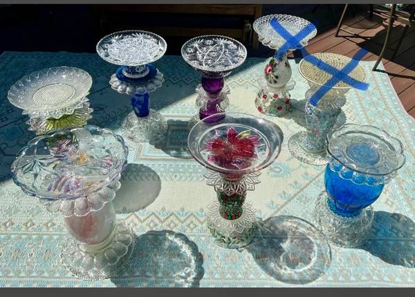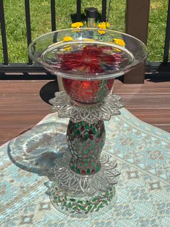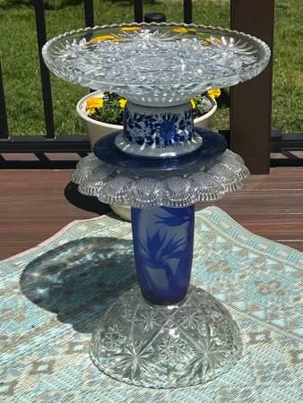 5 Bird Baths, vintage glass tables, plant stands, pedestals for $70 each.