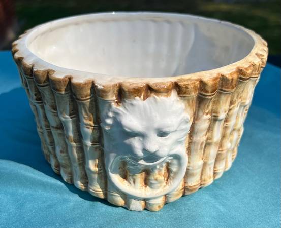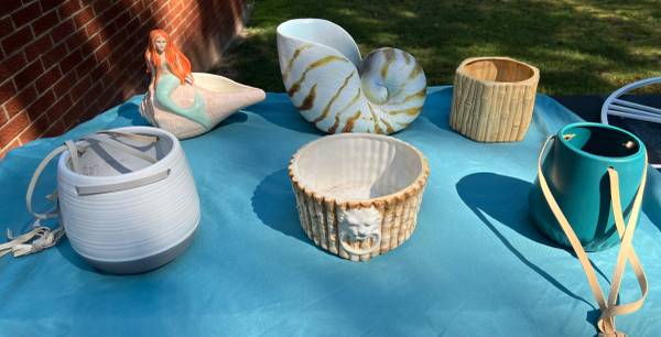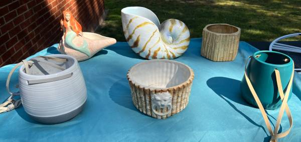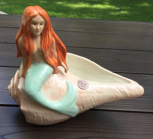 Planters/flower pots from $5 to 15 each. *All shown are still here. None of these have drain holes, so use small gravel. Mermaid on shell $. I need to check the price. Small brown ceramic bamboo...