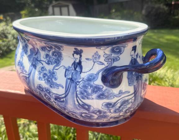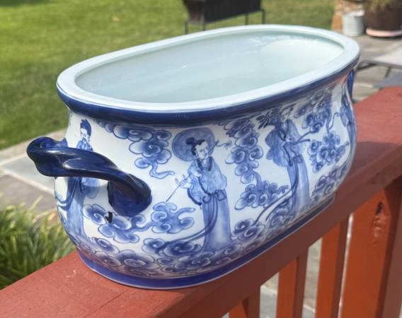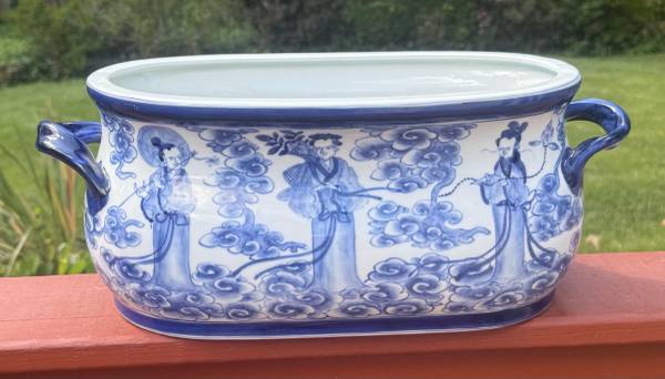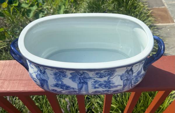 Experience the beauty and functionality of the Blue And White Foot Bath Planter. This high fire porcelain planter is hand shaped and painted, Its handcrafted design gives it a unique character, with minor variations in shape, size, and finish. This planter is versatile and can be used both indoors and outdoors, as it is waterproof and weatherproof.