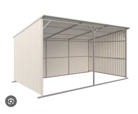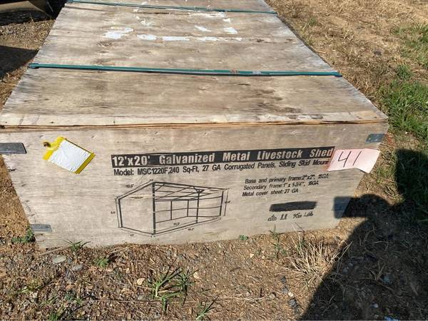 New 12ft x 20ft galvanized metal livestock run in shed. 240 sq ft. 27 GA roof and side panels. Creates are weathered from sitting outside. Buildings are white.