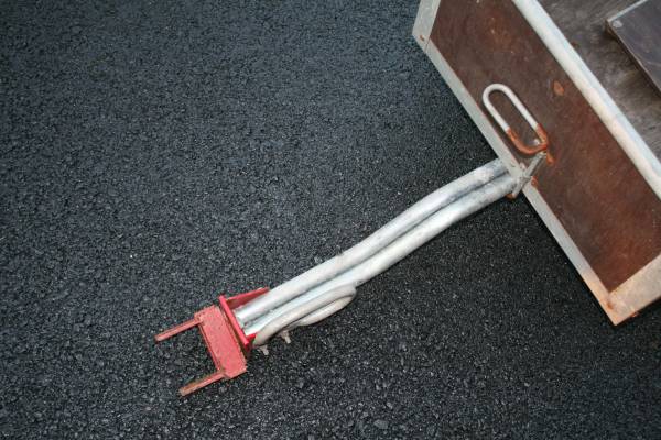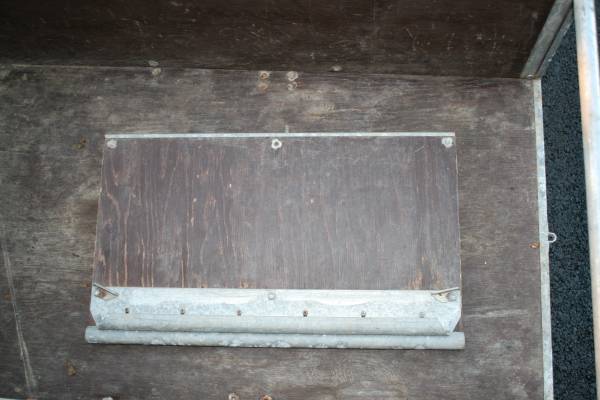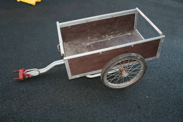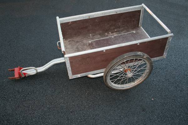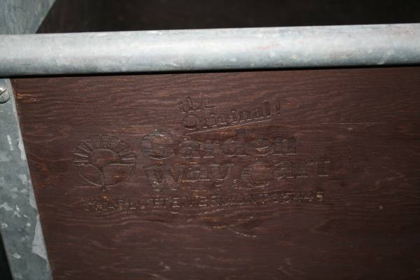 Garden Way pull behind cart which dumps. Good for lawn tractor to move mulch, leaves, etc. Has back door which slides in and out and is included (shown on floor of cart in pictures). Will need a van or pickup to move - it does not disassemble. No clue how much weight it can carry.