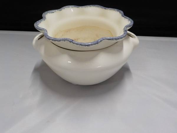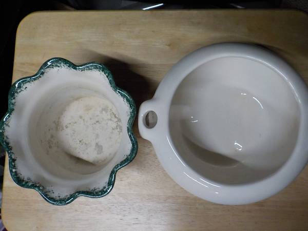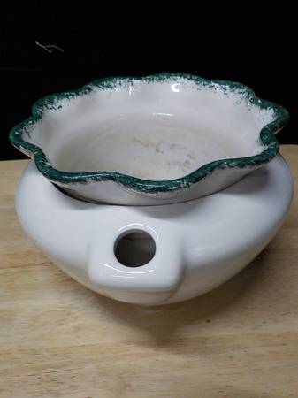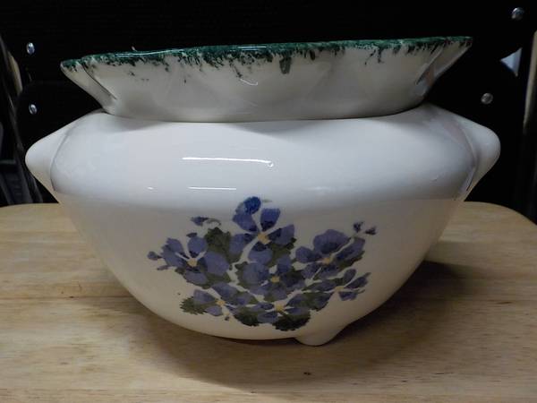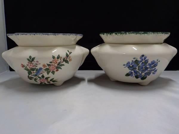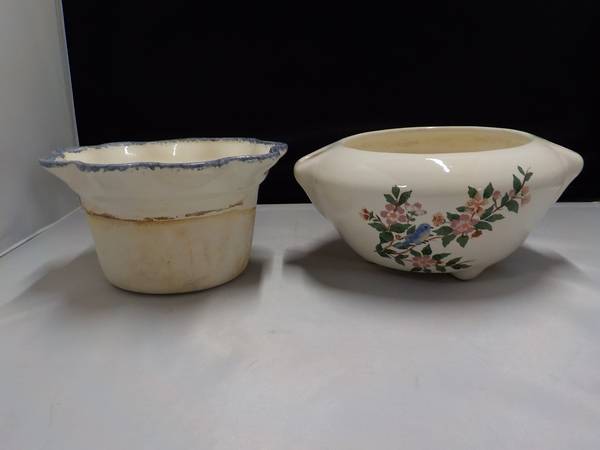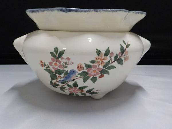 2 DIFFERENT AFRICAN VIOLET POTS. ONE HAS PURPLE FLOWERS AND THE OTHER HAS PINK FLOWERS WITH A BLUE BIRD. EACH POT IS $25.