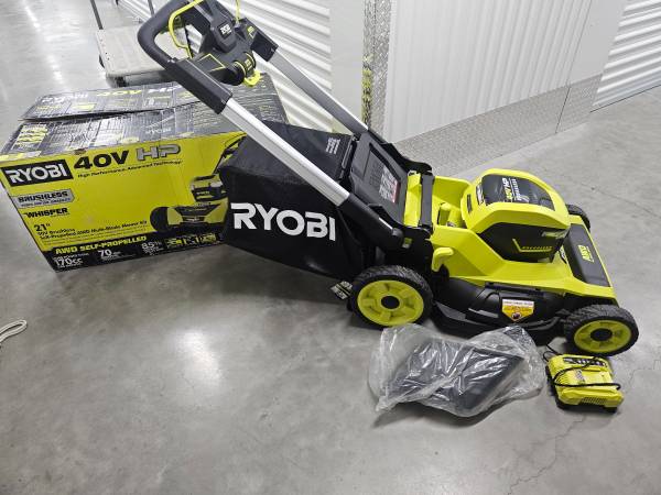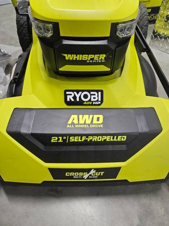 In like new condition Ryobi AWD multi blade 40V lawnmower selfpropelled. Has a small crack in the plastic handle. 2 batteries 6ah Charger Bagger