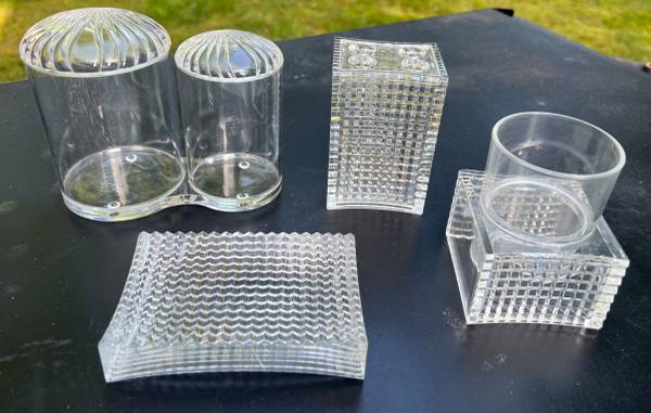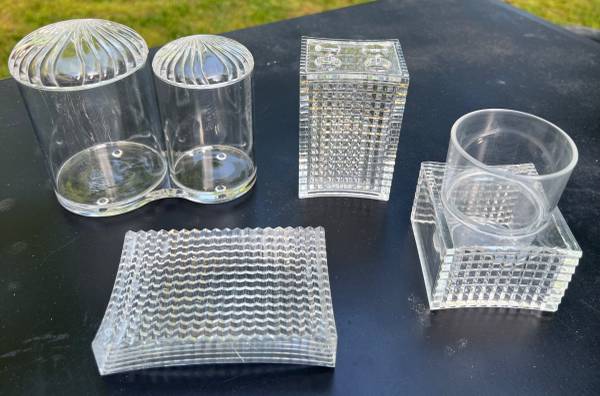 Clear lucite bathroom set for $15. Top rack dishwasher safe. Soap dish, cup and holder, toothbrush holder, 2 parts Q tip, cotton ball holder. See my other postings with the user link. ~ Kathy