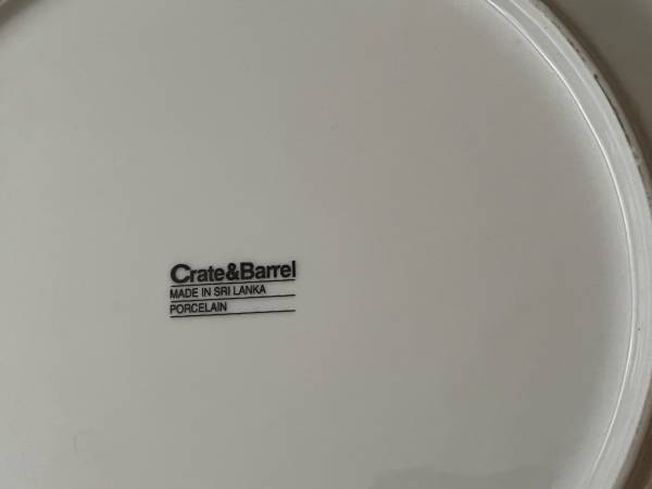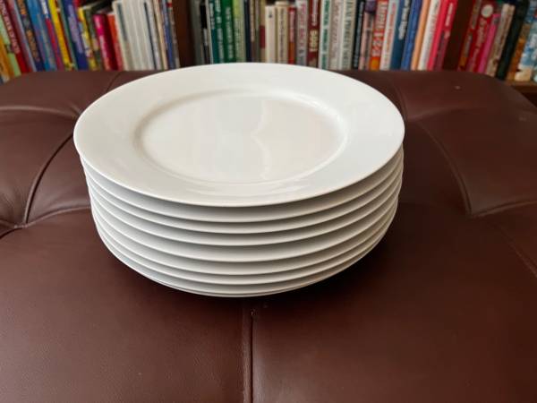 Crate and Barrel white dinner plate set of 9 for $30. Measure: 11 inches. View my other postings with the "more ads by this user" link. ~ Kathy