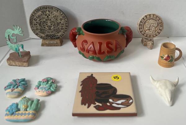Southwestern group of decor for $15. Salsa dish, coaster, magnet set, very tiny wood mug, etc. See the more ads by this user link for more items I am selling. ~ Kathy