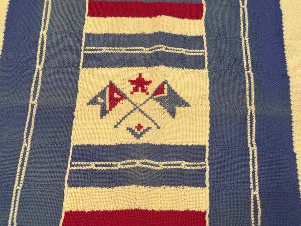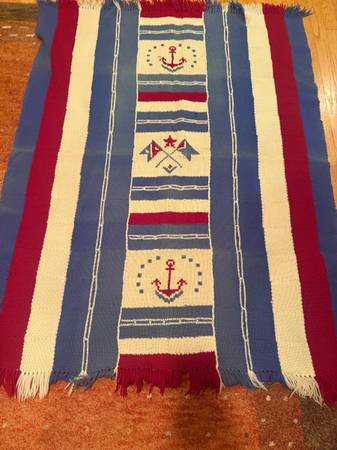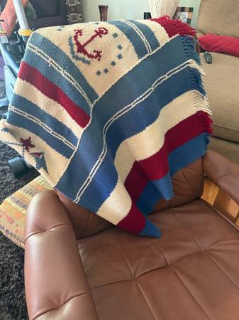 Beautiful handmade crochet Nantucket afghan nautically themed throw blanket. Made with wine red, Nantucket blue and cream white. Measures 55”x44” with additional 2 1/2” fringe in each side. In overall good vintage condition. I notice a couple small areas with loose weaving. See pictures.