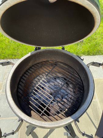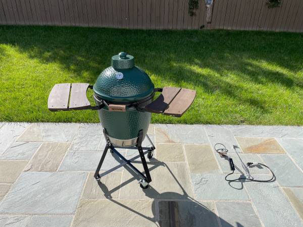 All items are in either new or like new condition. You will receive: Big Green Egg (medium) with cooking grate and top damper BGE Nest with wheels Two BGE Eggmate wood side surfaces that hold food...