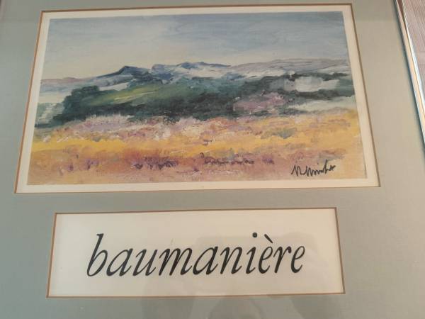 Framed water color landscape In very good condition silver metal frame with landscape and Baumanière. Ready for hanging Measures 14 1/2” length x 12 1/2” width and 1” depth. Is from the famed resort in the late 1980s/early 1990s.