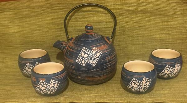 The set includes a teapot with a lid and a handle, along with four individual teacups. There is a strainer in teapot. All in good condition. No chips or cracks. Teapot is 5” tall and the teacups are...