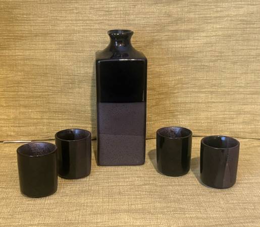 Black Ombre Sake Set. - Sleek, modern, and sophisticated. Great gift! Set includes one 14 oz. sake bottle and four sake cups. In very good condition Sake bottle: 2.5" square x 6.5"h; 14 oz....