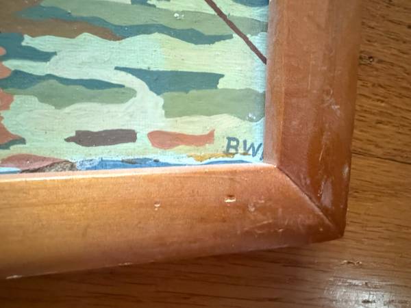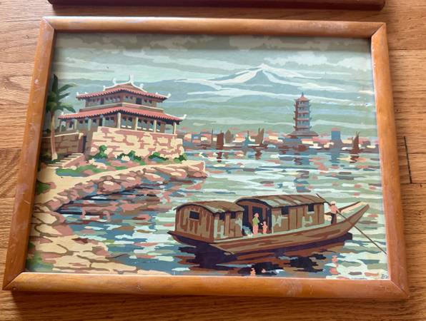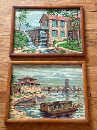 Paint by Number vintage 1960’s framed acrylic paintings. They both are similar vibrant looking colors. One is of a water mill and the other is an Asian pagoda and boat on water. They both measure...