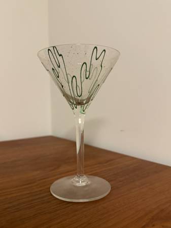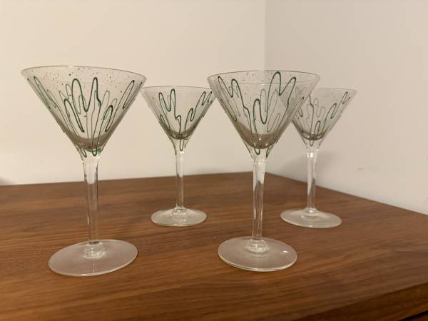 Set of four vintage martini glasses from ~1940s or 1950s. The glass has gold flake in it and each glass is hand-painted with a green design. Glasses are all in great shape.