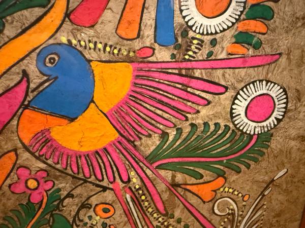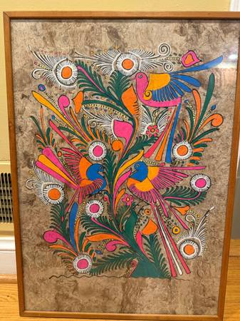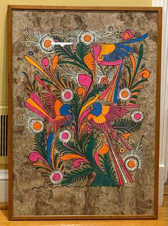 Vintage Mexican Folk Art Amate Bark Framed Painting Birds & Foliage...