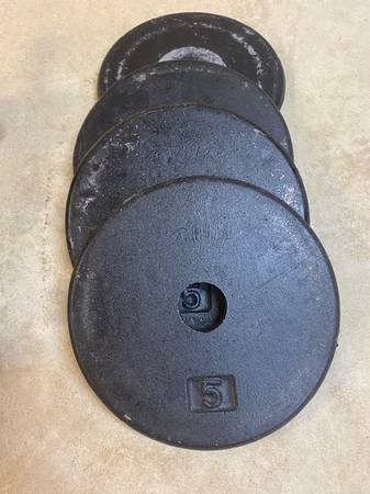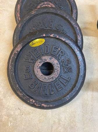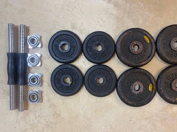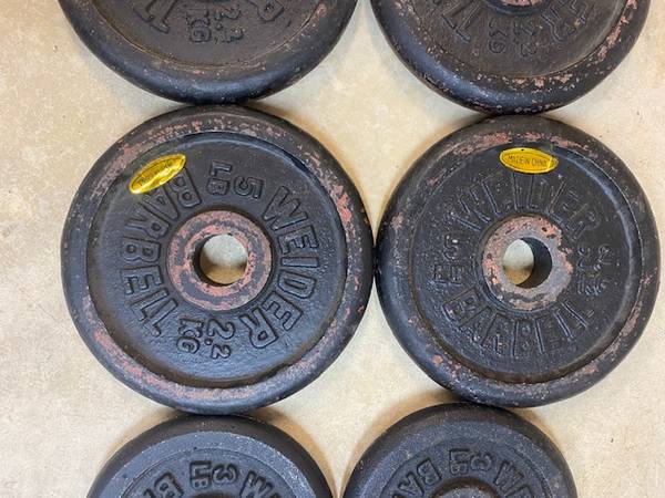 Antique weider weight plate four 5 pounds four 3 pounds two handle with stopper two adjustable Threaded Dumbbell Handles 1” h 1” Diameter