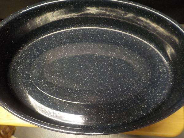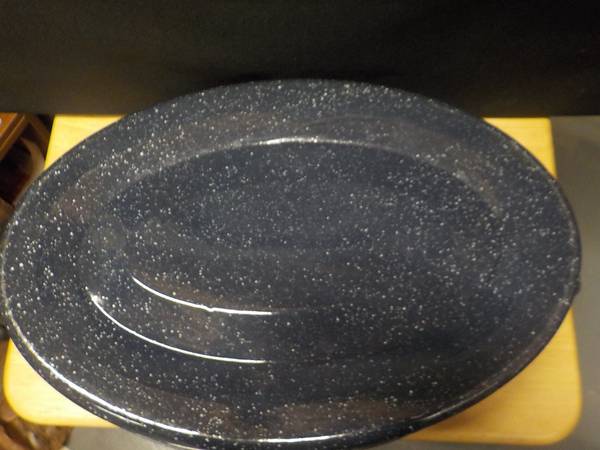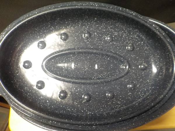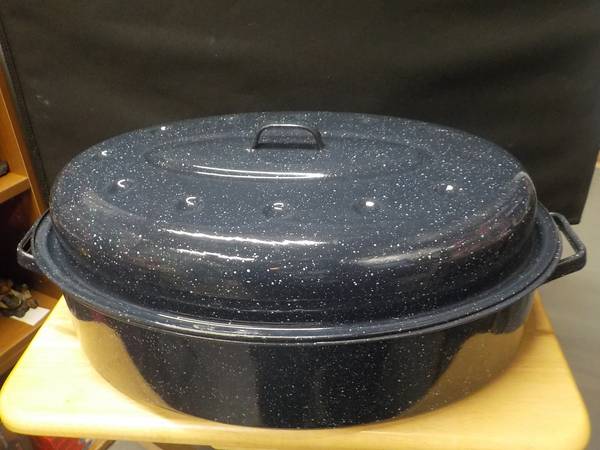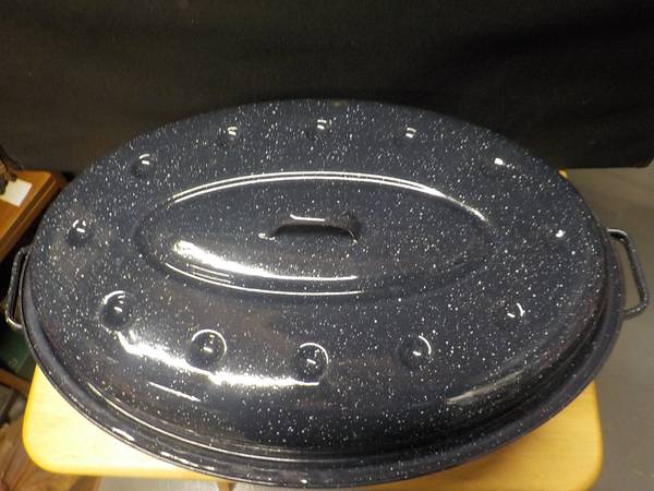 VINTAGE BLUE ENAMELWARE COVERED ROASTING POT WITH LID. IT IS 19" WIDE WITH THE HANDLES AND 7" TALL WITH HANDLE. $20