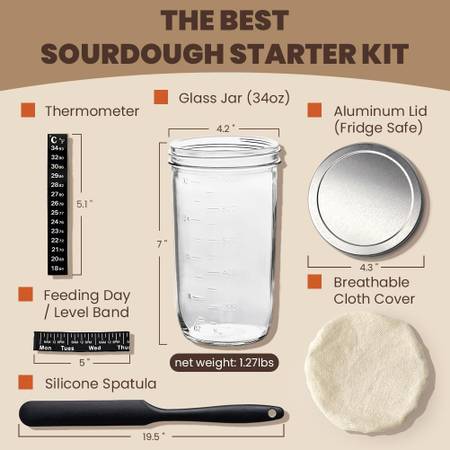 Combler Sourdough Starter Kit, 34oz Large Capacity Sourdough Bread Baking Supplies, Wide Mouth Glass Jar with Feeding Band, Thermometer, Spatula, Cloth Cover&Metal Lid, Kitchen Gadgets Baking...