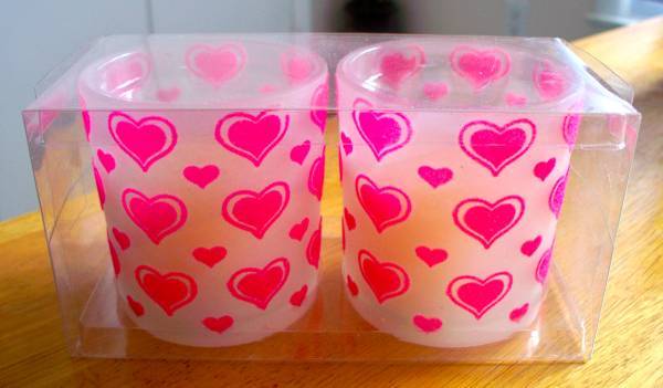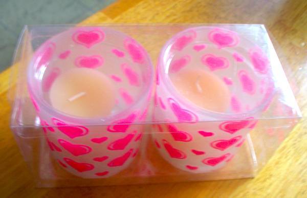 Heart candle set of 2 with fuzzy pink hearts on the glass and votive candles included for $5 Each measures: 3 1/4" high x 3" wide. See the more ads by this user link. ~Kathy