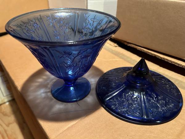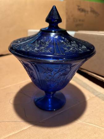 MAYFAIR OPEN ROSE GLASS COBALT BLUE 2PC. COVERED CANDY DISH IN EXCELLENT. THIS WAS MADE IN LATE 70`S. IT IS 7-1/2" HIGH FROM TIP OF LID AND OPENING IS 5-2/4" WIDE. Cash $20..... NOW REDUCE PRICE TO...