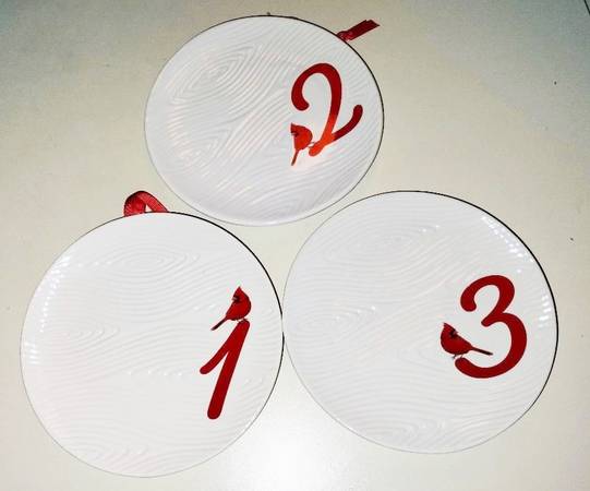 These are new, have never been used, and are from the Temp-tations seasonal set the Winter Woodland collection. There are 12 day of the month 6” plates that are numbered and adorned with an adorable cardinal, and a ribbon for the back. Imagine these adorable ornament-like ceramic plates sitting atop each of your festive place settings! Have some fun with your holiday dinner table, or use them to serve finger food at your next seasonal soiree. They each come with a ribbon, and can be hung on the wall. These are still new in the packaging.