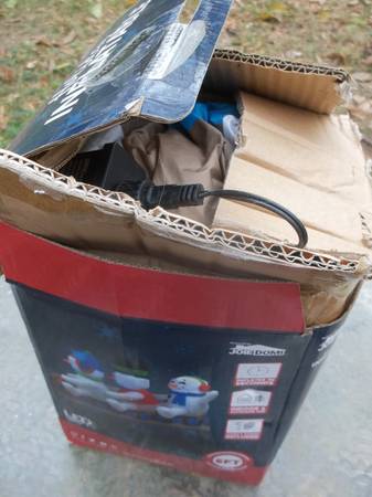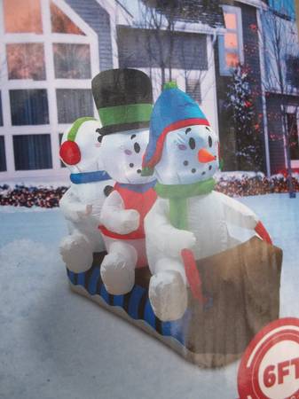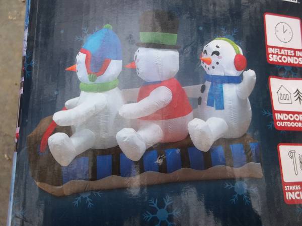 used. box has wear. inflatable works fine. 6 ft length. Christmas yard decoration. Three snowmen in a tobaggan / sled. Cute if perched atop or on the side of a hill. originally cost seventy dollars....