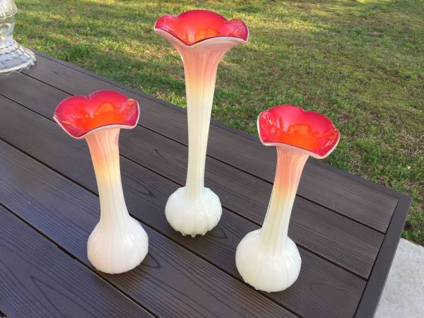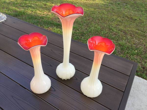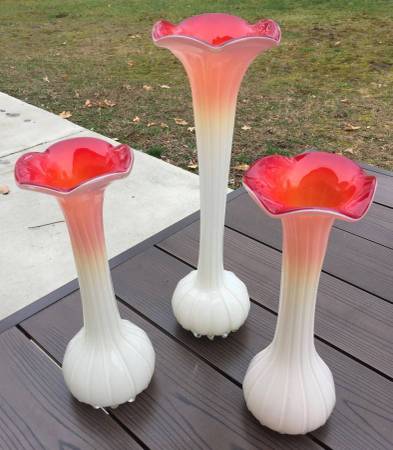 Set of 3 tall vintage white vases with red/orange inside for $35 or $15 each. Measurements: 12" 2 shorter and 15 1/2" largest. See the more ads by this user link for more items I am selling. ~ Kathy
