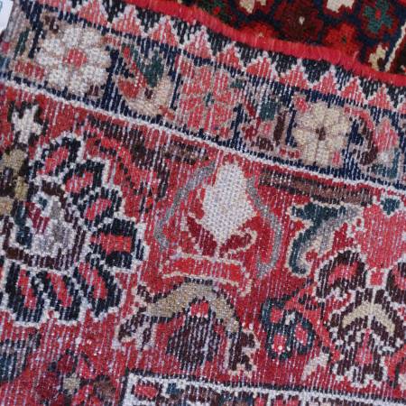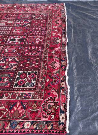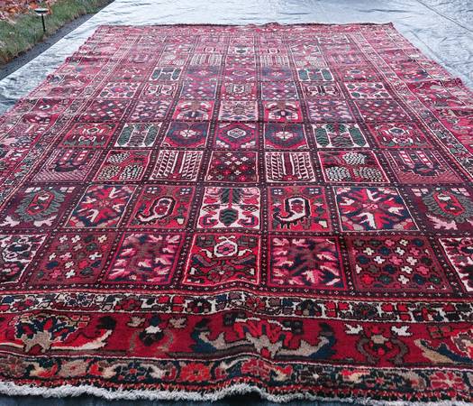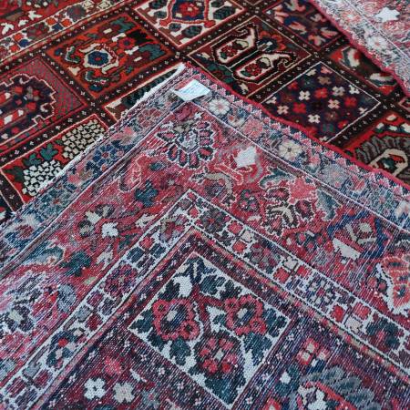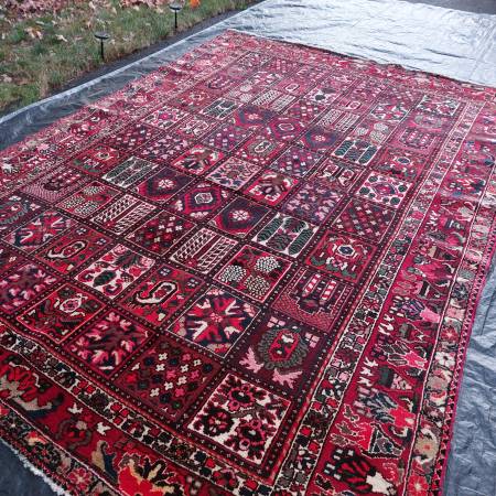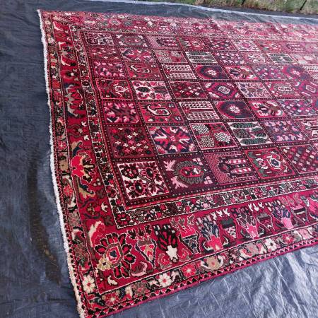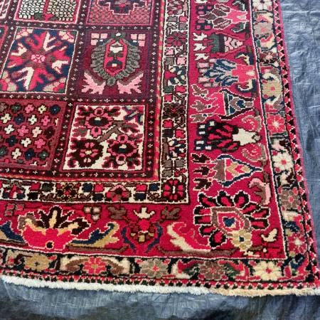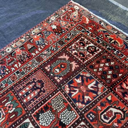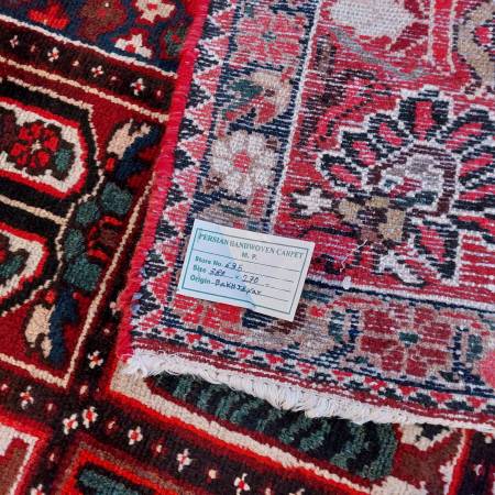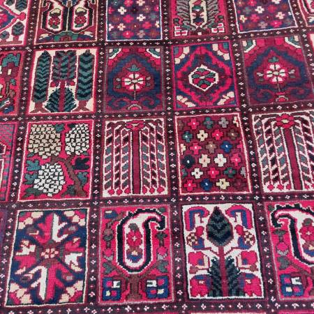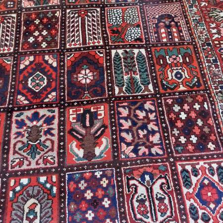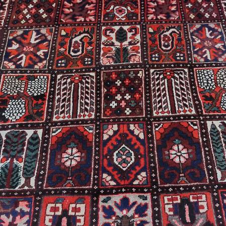 This Bakhtyari rug has a Rust field with a Beige border, featuring a Garden Design design. Made with 100% Wool with Cotton foundation. It has knot density of 196 kpsi.