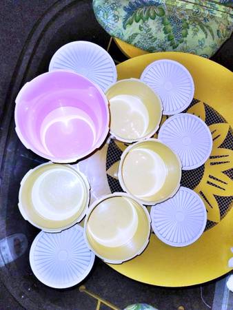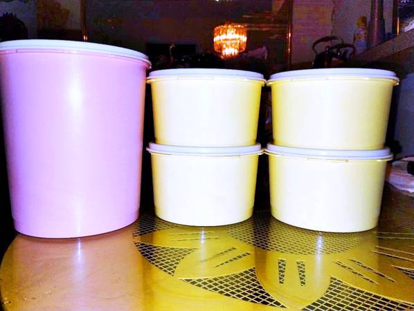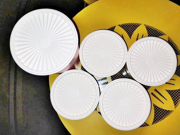This Tupperware 10-piece Heritage Canister Set is a must-have for any kitchen and is perfect for storing a variety of items. The set includes 5 canisters with push-down lids. The canisters are made of durable polypropylene plastic and are original Tupperware brand. Each canister has a solid pattern and a round shape, with the largest canister being 16 cups in size and the smallest canisters being 3.75 cups.