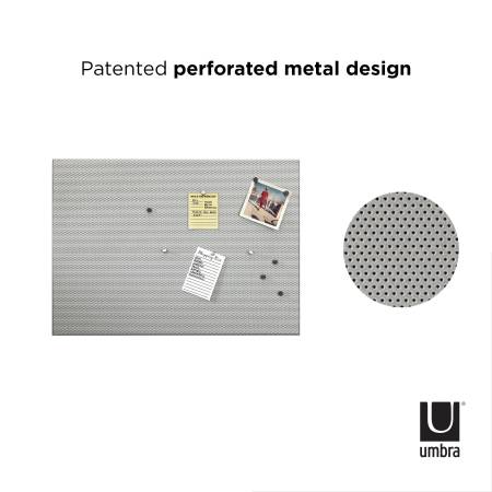 This contemporary twist on the classic corkboard adds fun and functionality to any room in your home or office. Bulletboard’s patented design has a modern and industrial construction consisting of a perforated metal surface that cleverly accommodates both pushpins and magnets. Ideal for large or small spaces, Bulletboard can be mounted vertically or horizontally.