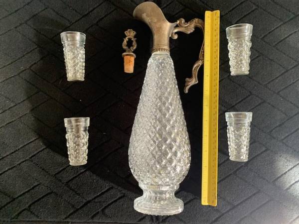 This rare vintage decanter & glassware was received as an "antique hunting" gift over 40 years ago. It was never used but displayed in our deco curio. With a little polishing (silver) it will be a beautiful piece to add to collection of unique bar or glassware. Cash & Carry only. Public Meetup.