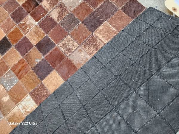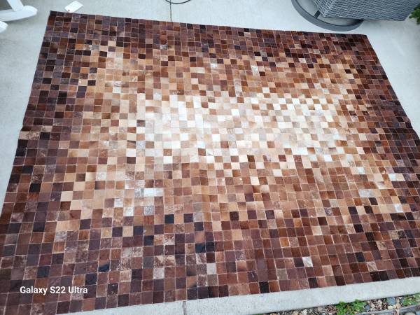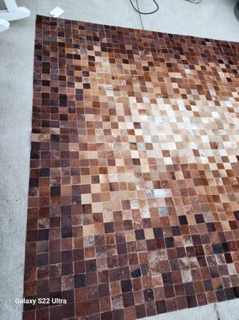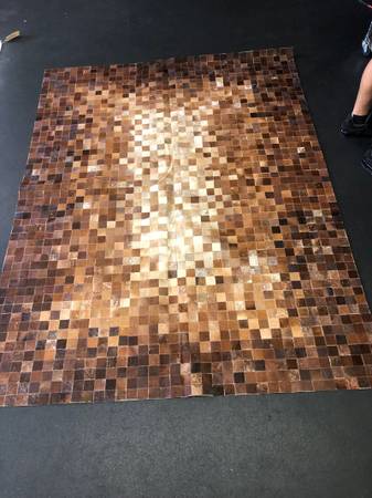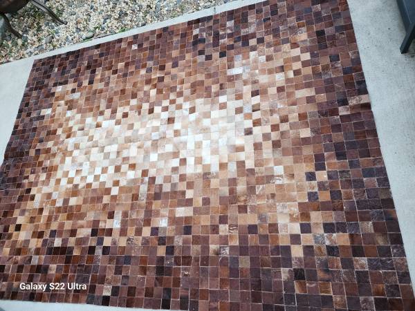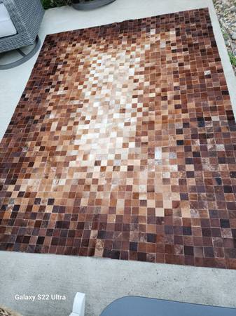 Beautiful 6 x 8 genuine leather cow hide patch design area rug. Excellent condition Made in Turkiye