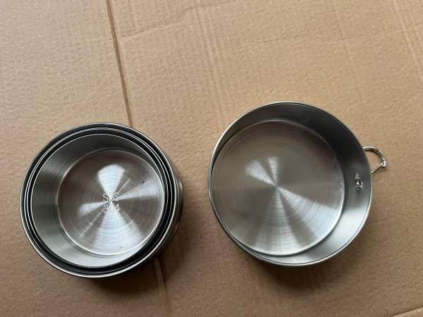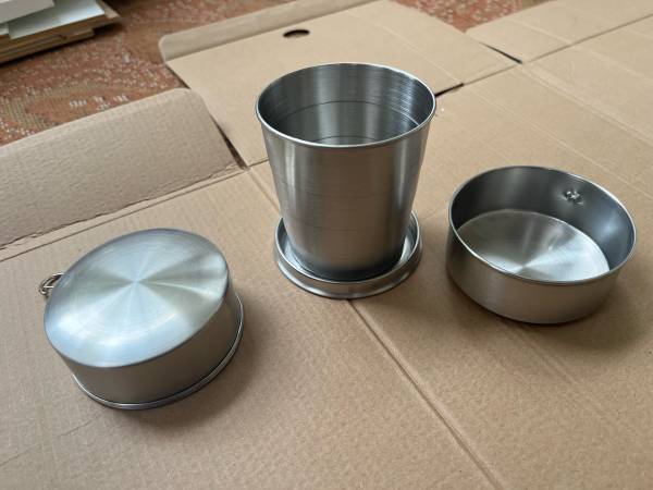 Collapsible metal cups with a latch to attach to backpack, etc. These are handy but you have to be careful not to let the cup sides collapse once filled with your drink. $5 for two.