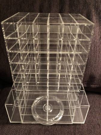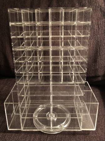 A solid condition rotating cosmetics display for your bathroom and/or makeup room. Measurements: Height: 13” Width: 10” Depth: 5” Cash only. $38 For local pickup only in the Calverton/Fairland area...