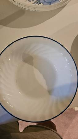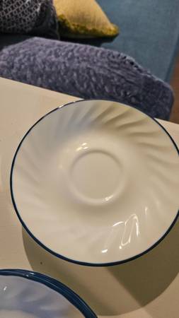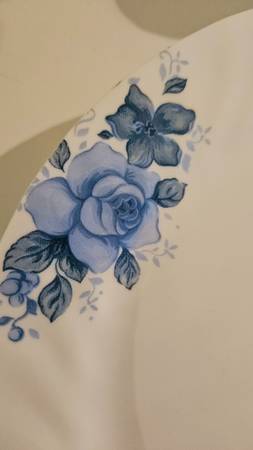 White and blue floral dish and mug set in excellent condition. 6 dinner plates, 2 medium sized plates, 4 salad plates, 4 bowls 4 saucers, and 4 mugs. Dishware is microwave safe. Cash only, please...