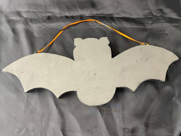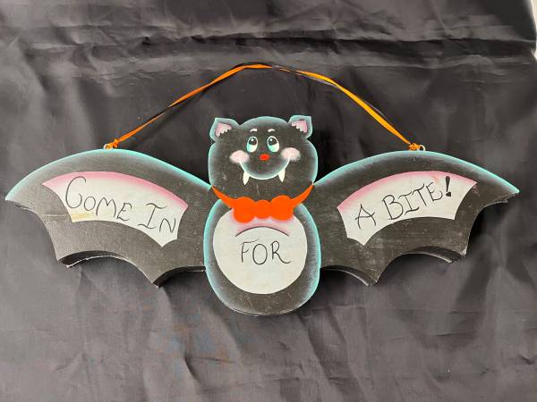 Decorative bat sign with 'Come In For A Bite!' message. Handpainted on wood, backing is foam so it will not scratch any surfaces. Satin ribbon for hanging. measures 14” long x 6” tall. Perfect for your Halloween party. E-mail for payment and pickup arrangements. CASH only.