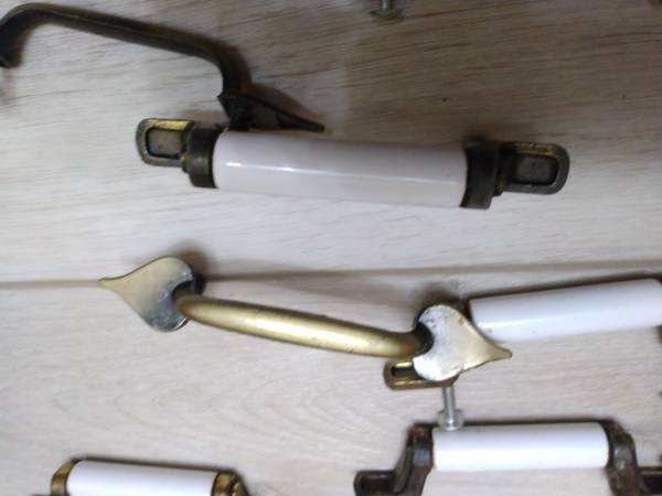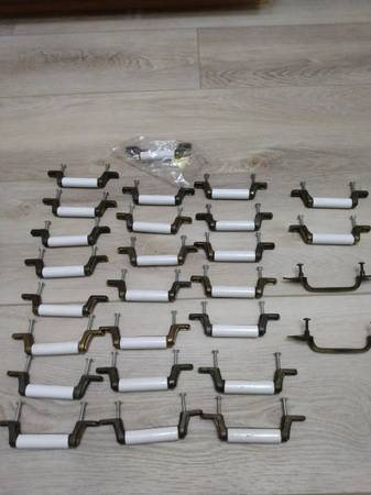 Selling over 25 used with one new cabinet handles or only $25. A white porcelain ones have 3-inch center to center screw holes and the two brass ones have 3-1/4 inch center to center screw holes....