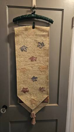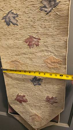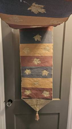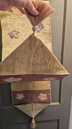 New and unused fall themes table runner with leaf pattern and tassels. Approximately 13" wide and 66" long. $5 cash only. Contact by email if interested. Thanks.