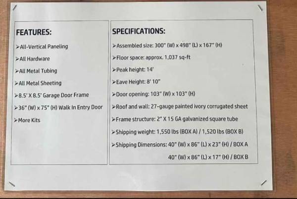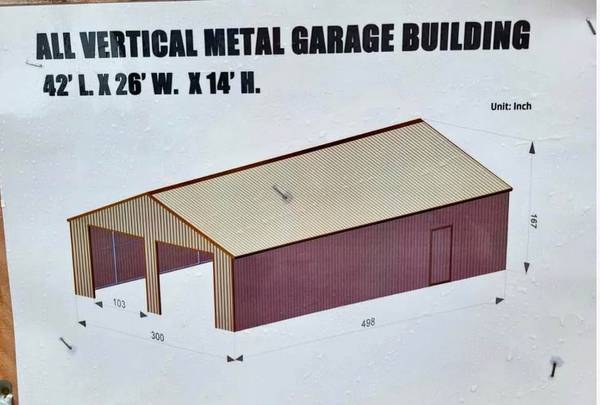 New 26’ x 42’ garage. Comes with all metal for frame, roof, and siding. It does not come with garage doors but has 2 openings 8.5’ each. 36” x 75” side entry door. Approximately 1037’ floor space. 14’ peak height and 8’ 10” wall height. Roof and walls are 27 gage ivory painted sheet metal. Frame is 2” x 15 gage galvanized metal tubing. Box A is 1550 lbs box B is 1520 lbs. little over 3000lbs together.