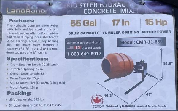 This Concrete Mixer has an all welded steel drum and internal paddles offer uniform mixing and clean dumping. Greaseable bronze Oilite bearings provide long bearing life. The mixer features a capacity of 5 ft³ (141 ltr) and a total drum capacity of 9 ft³ (254 ltr). Comes complete with skid steer universal mounting plate, parking stand, hoses and flat face couplers.