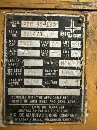 Big Joe Walkie Counterbalance Stacker 3,000lb capacity 24 volt battery 130 inch lift height Includes charger