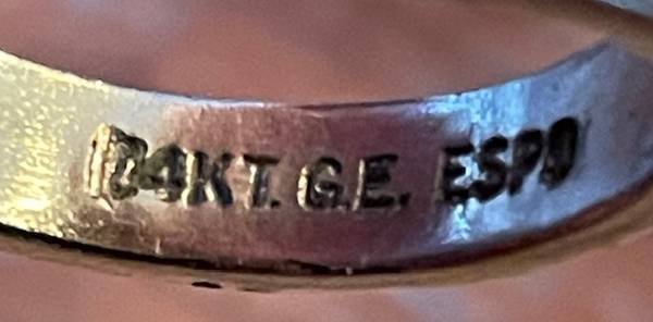 First ring has a large round stone framed in a gold square with beaded trim. The band incorporates a three-dimensional design that is visible from the top of the ring. Inside of band is stamped "14 KT GE ESPO."